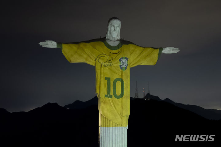 [리우데자네이루=AP/뉴시스] 브라질 축구 전설 펠레 사망 1주기를 맞아 29일(현지시각) 리우데자네이루에 있는 그리스도상에 펠레의 유니폼 이미지가 조명으로 비치고 있다. 펠레는 지난해 12월 29일 암 투병 끝에 82세 나이로 사망했다. 2023.12.30.