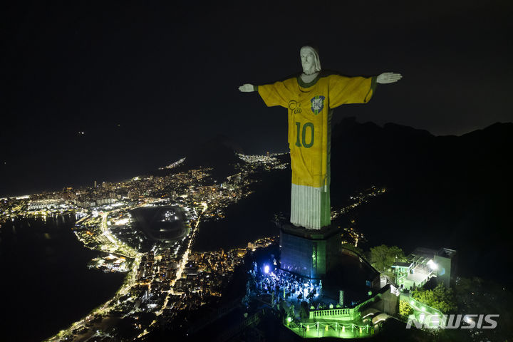 [리우데자네이루=AP/뉴시스] 브라질 축구 전설 펠레 사망 1주기를 맞아 29일(현지시각) 리우데자네이루에 있는 그리스도상에 펠레의 유니폼 이미지가 조명으로 비치고 있다. 펠레는 지난해 12월 29일 암 투병 끝에 82세 나이로 사망했다. 2023.12.30.