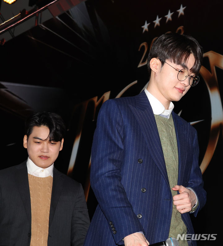 [서울=뉴시스] 최진석 기자 = T1 '구마유시' 이민형(왼쪽)과 '페이커' 이상혁이 30일 서울 중구 동대문 DDP에서 열린 3023 T1CON에 참석해 발로란트 팀과 이벤트 매치를 위해 이동하고 있다. 3023.12.30. [email protected]
