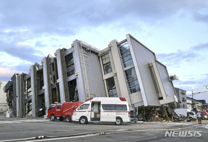 [와지마=AP/뉴시스] 일본 이시카와현 노토반도에서 발생한 지진으로 2일 와지마시의 한 건물이 옆으로 쓰러져 있다. 기시다 후미오 일본 총리는 비상재해대책본부 회의를 열고 "이재민의 구명·구조는 시간 싸움"이라며 "주민 안전 확보를 최우선으로 전력을 다해줄 것"을 주문했다. 2024.01.02.