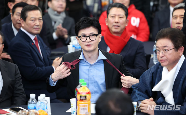[대구=뉴시스] 이무열 기자 = 한동훈 국민의힘 비대위원장이 2일 대구 북구 엑스코에서 열린 2024 국민의힘 대구경북 신년인사회에서 넥타이를 풀고 있다. 2024.01.02. [email protected]