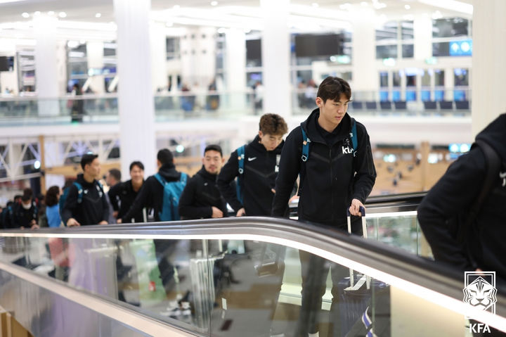 [서울=뉴시스] 2023 AFC 카타르 아시안컵에 출전하는 축구국가대표팀이 2일(현지시간) 아랍에미리트 두바이국제공항에 도착해 이동하고 있다. 대표팀은 아부다비에서 전지훈련을 한 뒤 6일 이라크와 최종 평가전을 치른다. (사진=대한축구협회 제공) 2024.01.03. [email protected] *재판매 및 DB 금지