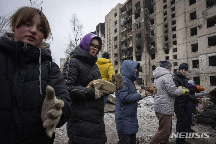[키이우=AP/뉴시스] 3일(현지시각) 우크라이나 키이우에서 자원봉사자와 주민들이 전날 러시아의 공격으로 파손된 아파트 잔해를 치우고 있다. 2024.01.04.