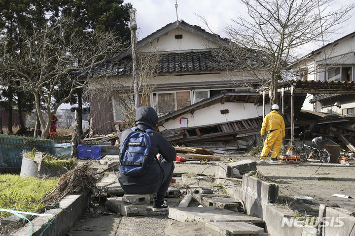 [스즈=AP/뉴시스] 5일 일본 이시카와현 스즈시에서 한 남성이 무너진 집 아래 갇힌 모친의 구조 작업 모습을 지켜보고 있다. 지난 1일 이시카와현 노토반도에서 발생한 강진으로 지금까지 사망자는 94명으로 늘어났으며 골든 타임이 지나면서 이 숫자는 늘어날 것으로 보인다. 2024.01.05.