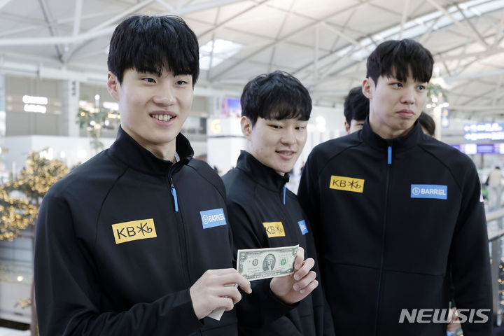 [인천공항=뉴시스] 최동준 기자 = 수영 대표팀 황선우가 5일 인천국제공항에서 전지훈련 차 호주로 출국 전 정창훈 대한수영연맹 회장에게 선물 받은 행운의 2달러를 들어 보이고 있다. 2024.01.05. [email protected]