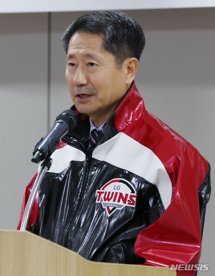 [서울=뉴시스] 김진아 기자 = 5일 서울 송파구 잠실야구장에서 열린 2024년 LG트윈스 선수단 신년인사회에서 김인석 대표이사가 인사말을 하고 있다. 2024.01.05. [email protected]