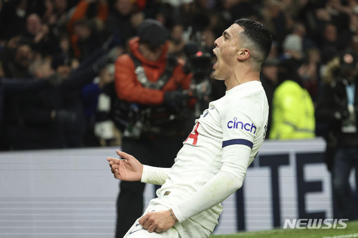 [런던=AP/뉴시스] 토트넘 홋스퍼의 페드로 포로가 5일(현지시각) 영국 런던의 토트넘 홋스퍼 스타디움에서 열린 2023-24 잉글랜드 축구협회(FA)컵 3라운드 번리와의 경기 후반 33분 선제골을 넣고 환호하고 있다. 손흥민이 빠진 토트넘은 포로의 결승 골로 1-0으로 승리해 4라운드(32강)에 진출했다. 2024.01.06.