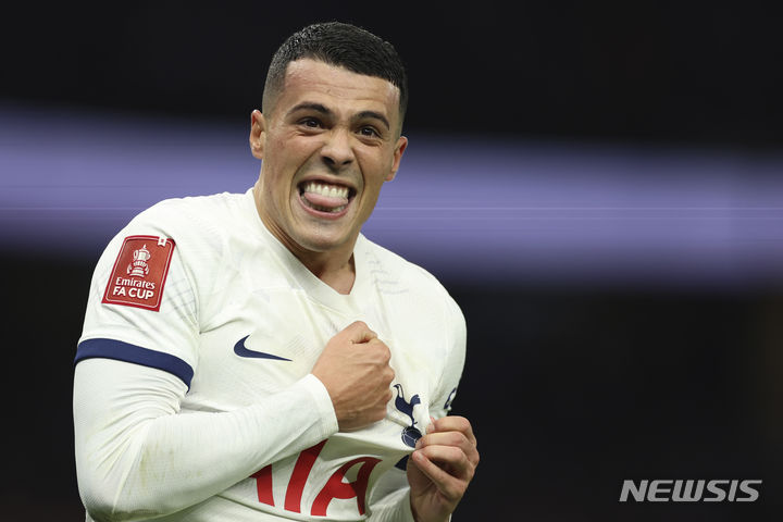 [런던=AP/뉴시스] 토트넘 홋스퍼의 페드로 포로가 5일(현지시각) 영국 런던의 토트넘 홋스퍼 스타디움에서 열린 2023-24 잉글랜드 축구협회(FA)컵 3라운드 번리와의 경기 후반 33분 선제골을 넣고 환호하고 있다. 손흥민이 빠진 토트넘은 포로의 결승 골로 1-0으로 승리해 4라운드(32강)에 진출했다. 2024.01.06.