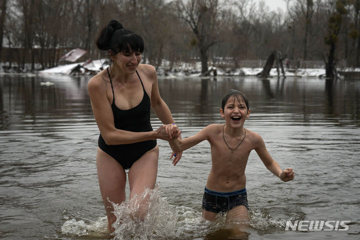 [키이우=AP/뉴시스] 6일(현지시각) 우크라이나 키이우에서 전통 주현절 행사가 열려 한 여성이 아이와 함께 차가운 드니프로강에 걸어 들어가고 있다. 신자들은 성직자의 축복을 받은 물을 이듬해 주현절까지 거룩하고 순수한 것으로 여겨 특별한 보호와 치유의 힘을 지닌 것으로 믿고 있다. 2024.01.07.