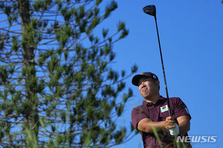 [카팔루아=AP/뉴시스] 안병훈이 6일(현지시각) 미 하와이주 카팔루아의 플랜테이션 코스에서 열린 미국프로골프(PGA) 투어 더 센트리 3라운드 3번 홀에서 티샷하고 있다. 안병훈은 중간 합계 19언더파 200타를 치며 공동 3위로 도약했다. 2024.01.07.