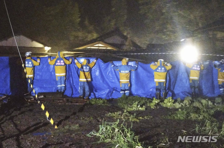 [스즈=AP/뉴시스] 6일 일본 이시카와현 스즈의 붕괴 건물에서 90대 여성이 구조되는 현장 모습을 경찰관들이 파란 천으로 가려주고 있다. 지진 발생 124시 만인 이날 오후 90세 여성 1명이 구조됐다. 2024.01.07.
