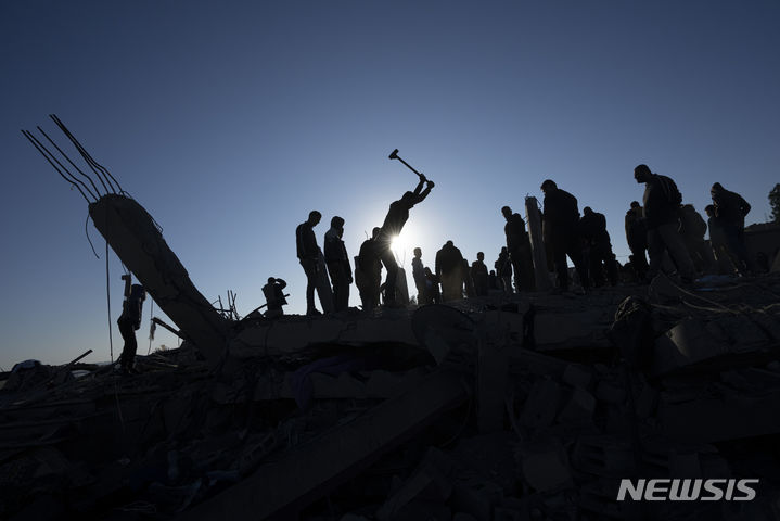 [라파=AP/뉴시스] 7일(현지시각) 가자지구 남부 라파에서 팔레스타인 주민들이 이스라엘의 공습으로 파괴된 주택 잔해 속에서 희생자 시신과 생존자를 찾고 있다. 2024.01.08.