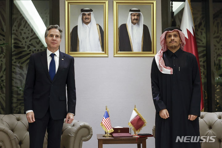 [루사일=AP/뉴시스] 토니 블링컨(왼쪽) 미국 국무장관이 7일(현지시각) 카타르 루사일궁에서 모하메드 빈 압둘라흐만 알 사니 총리 겸 외교장관과 회담하고 있다. 블링컨 장관은 이스라엘-하마스 전쟁 발발 이후 중동 지역 긴장 완화를 위해 4번째 중동 순방 중이며 튀르키예, 그리스, 요르단, 카타르를 거쳐 11일까지 아랍에미리트(UAE), 사우디아라비아를 방문한다. 2024.01.08.