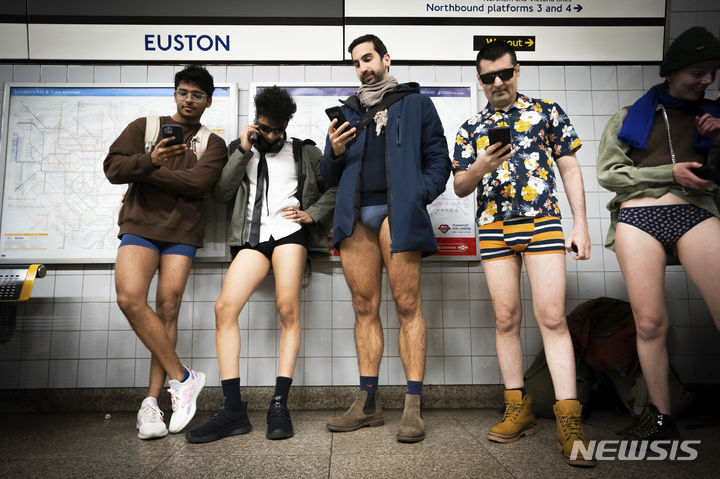 [런던=AP/뉴시스] 7일(현지시각) 영국 런던에서 연례 '바지 벗고 지하철 타기' 행사가 열려 바지를 입지 않은 사람들이 유스턴역에 모여 있다. 이 행사는 지난 2002년 뉴욕에서 시작해 전 세계적으로 확산했으며 참가자들은 하의를 제외한 코트와, 장갑, 목도리 등을 착용할 수 있고 정해진 날짜에 지하철을 타 자연스럽게 행동한다. 2024.01.08.