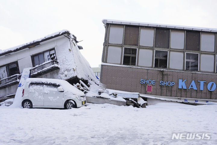[아나미즈=AP/뉴시스] 8일 일본 이시카와현 아나미즈에서 지진으로 파손된 건물들이 눈에 덮여 있다. 이시카와현 노토반도 강진으로 지금까지 사망자는 161명, 실종자는 103명으로 집계됐다. 2024.01.08.