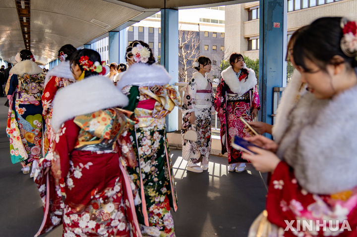 [요코하마=신화/뉴시스] 8일 일본 요코하마에서 전통 의상을 입은 여성들이 성년의 날 행사가 열리는 식장으로 향하고 있다. 일본은 2022년 4월 민법 개정으로 성인 나이가 20세에서 18세로 낮아졌으며 성년의 날은 매년 1월 둘째 월요일로 법정 공휴일이다. 2024.01.09.