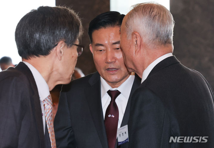 [서울=뉴시스] 황준선 기자 = 신원식(가운데) 국방부 장관이 10일 오전 서울 중구 더 플라자 호텔 서울에서 열린 국가전략연구원(KRINS)-브루킹스 연구소 국제회의에 참석해 윤영관(왼쪽) 전 외교통상부 장관과 권영해(오른쪽) 전 국방부 장관과 대화하고 있다. 2024.01.10. [email protected]