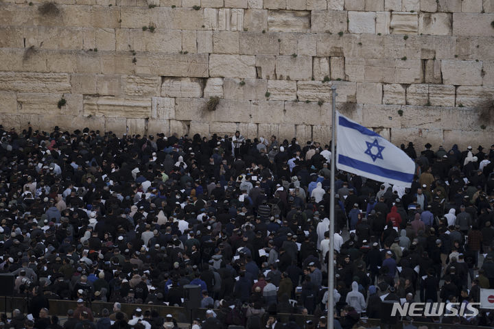 [예루살렘=AP/뉴시스] 10일(현지시각) 이스라엘 예루살렘 구시가지의 통곡의 벽 앞에서 이스라엘 사람들이 하마스에 억류된 인질들의 석방을 촉구하는 대규모 기도회에 참석하고 있다. 지난해 11월 말 일주일간의 임시 휴전 당시 105명의 인질이 풀려나 132명가량이 아직 억류된 것으로 추정되며 이중 약 20명이 숨진 것으로 보인다. 2024.01.11.