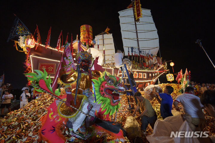 [말라카=AP/뉴시스] 11일(현지시각) 말레이시아 말라카에서 전통 왕캉(왕선) 축제가 열려 사람들이 바다에서 목숨을 잃은 영혼(선한 형제)들이 승선한 왕캉선을 불에 태울 준비를 하고 있다. 이 축제는 선한 형제들이 승선한 왕캉선을 불에 태워 영혼들을 더 좋은 곳으로 보내는 송별식으로 마무리된다. 왕캉 축제는 말라카 해안지역에서 지역민의 평화와 안녕을 기원하는 전통 축제 문화로 중국에서 전파돼 말라카에서 1845년 처음 거행됐으며 2020년 유네스코 인류무형문화유산에 등재됐다. 2024.01.12.