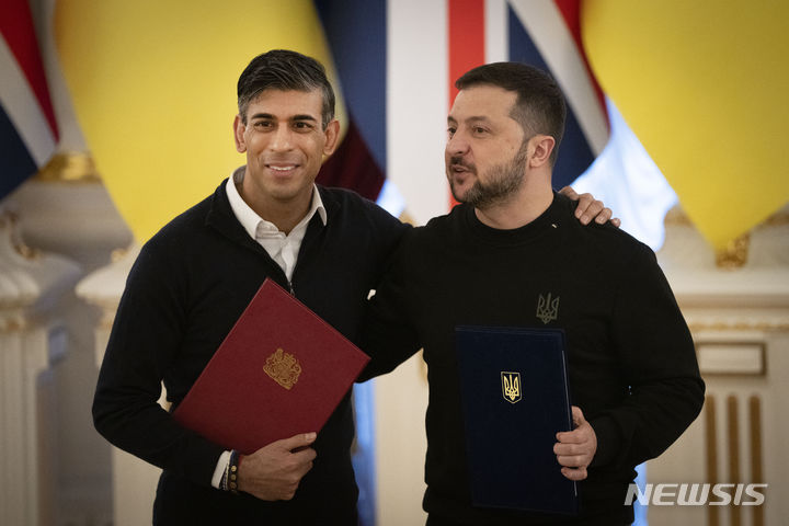 [키이우=AP/뉴시스] 볼로디미르 젤렌스키(오른쪽) 우크라이나 대통령이 12일(현지시각) 키이우에서 리시 수낵 영국 총리와 안보 협정에 서명한 후 기념 촬영을 하고 있다. 수낵 총리는 우크라이나군의 전력 보강 등을 위해 25억 파운드(약 4조2천억 원) 규모의 지원 제공을 약속했다. 2024.01.13.