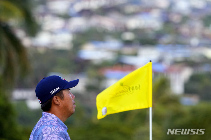 [호놀룰루=AP/뉴시스] 안병훈이 12일(현지시각) 미 하와이주 호놀룰루의 와이알레이 CC에서 열린 미국프로골프(PGA) 투어 소니 오픈 2라운드 18번 그린에서 호흡을 가다듬고 있다. 첫날 공동 16위였던 안병훈은 중간 합계 9언더파 131타 공동 선두로 올라섰다. 2024.01.13.