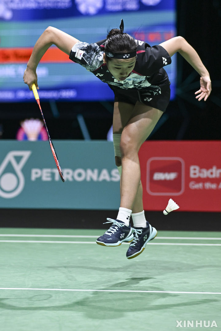 [쿠알라룸푸르=신화/뉴시스] 안세영(1위)이 13일(현지시각) 말레이시아 쿠알라룸푸르에서 열린 세계배드민턴연맹(BWF) 말레이시아 오픈(슈퍼1000) '페트로나스 말레이시아 2024' 여자 단식 준결승전에서 장이만(17위·중국)과 경기하고 있다. 안세영이 2-0(21-17 21-11)으로 이기고 결승에 진출해 타이추잉(4위·대만)과 우승을 다툰다. 2024.01.14.