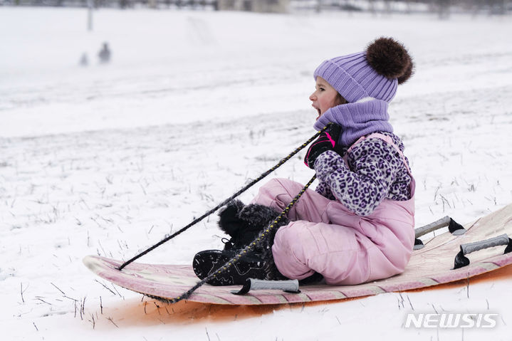 [시카고=AP/뉴시스] 13일(현지시각) 미 일리노이주 시카고 인근에 눈보라가 몰아친 후 5세 소녀가 눈썰매를 타고 있다. 3일간의 마틴 루서 킹 연휴가 시작된 주말, 북극 폭풍의 물결이 오리건주의 얼음 폭풍 주의보에서 북부 평원의 눈보라 주의보, 뉴멕시코주의 강풍 주의보까지 이어졌다. 2023.01.14.