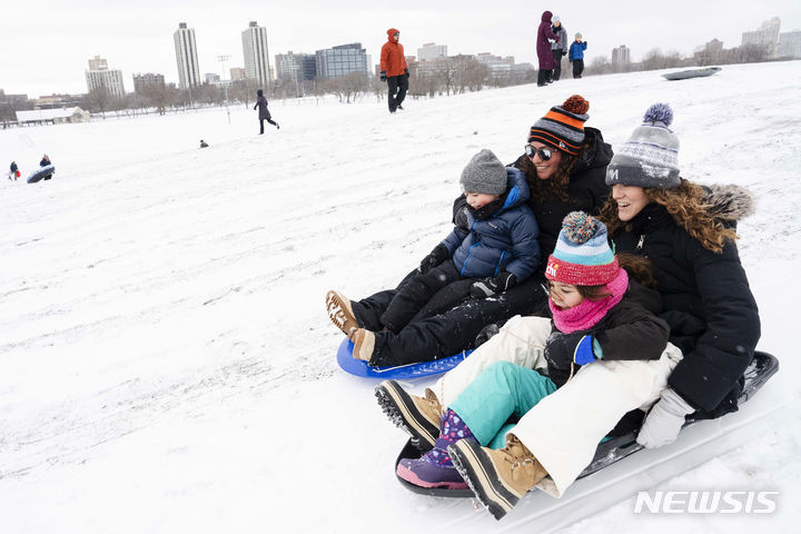 [시카고=AP/뉴시스] 13일(현지시각) 미 일리노이주 시카고 인근에 눈보라가 몰아친 후 크리켓 언덕에서 한 부부가 자녀들과 함께 눈썰매를 타고 있다. 3일간의 마틴 루서 킹 연휴가 시작된 주말, 북극 폭풍의 물결이 오리건주의 얼음 폭풍 주의보에서 북부 평원의 눈보라 주의보, 뉴멕시코주의 강풍 주의보까지 이어졌다. 2023.01.14.
