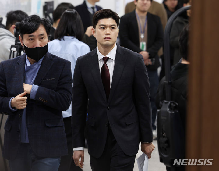 [서울=뉴시스] 추상철 기자 = 김용태 전 국민의힘 청년최고위원이 15일 오전 서울 여의도 국회에서 제22대 총선 포천시·가평군 출마 선언 및 국민의힘 잔류 관련 입장 발표를 위해 입장하고 있다. 2024.01.15. [email protected]