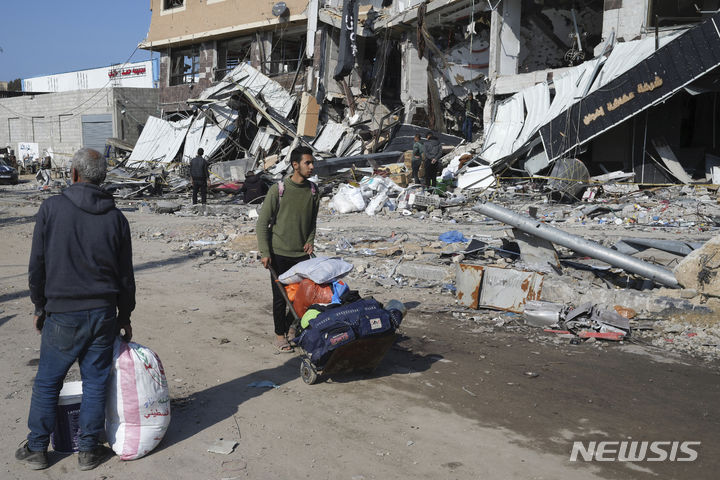 [가자지구=AP/뉴시스] 16일(현지시각) 가자지구 누세이라트 난민촌 팔레스타인 주민들이 이스라엘의 폭격으로 파괴된 건물 잔해에서 가재도구를 찾아 옮기고 있다. 2024.01.17.