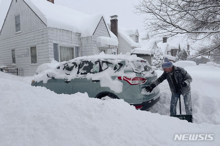 [버펄로=AP/뉴시스] 17일(현지시각) 미 뉴욕주 버펄로의 한 주민이 집 앞 자동차에 쌓인 눈을 치우고 있다. 버펄로에는 지난 주말 약 92㎝의 눈이 내렸으며 호수 효과로 밤새 45㎝의 눈이 더 내렸다. 현지 당국은 오후까지 시간당 최대 10㎝가량의 눈이 더 내릴 것으로 예보했으며 시청은 폐쇄됐고 학교도 휴교했다. 2024.01.18.
