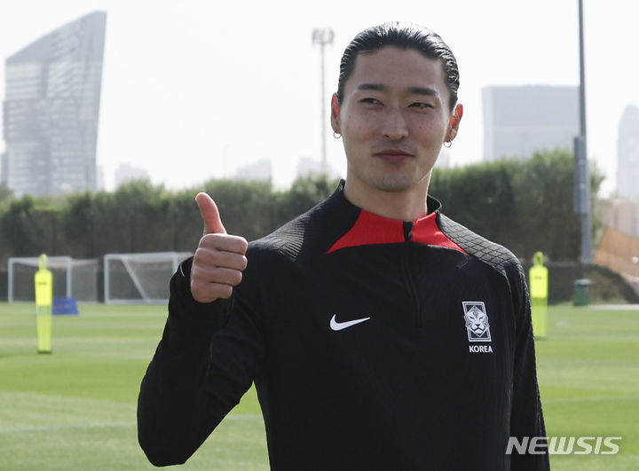[도하(카타르)=뉴시스] 김근수 기자 = 2023 AFC 카타르 아시안컵에 출전 중인 대한민국 축구대표팀 조규성이 18일(현지시각) 카타르 도하 알 에글라 트레이닝 센터에서 훈련 시작 전 취재진 질문에 답하는 도중 엄지를 들어보이고 있다. 2024.01.18. [email protected]