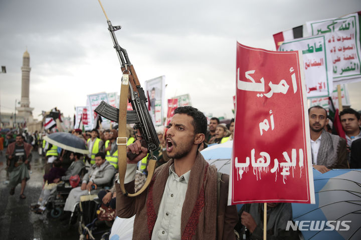 [사나=AP/뉴시스] 후티 반군 지지자들이 19일(현지시각) 예멘 사나에서 가자지구 팔레스타인인들과 연대하고 후티 반군을 테러 집단으로 지정한 미국에 반대하는 집회를 열고 구호를 외치고 있다. 2024.01.20.
