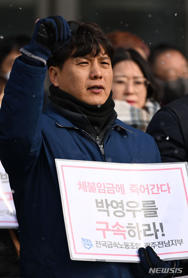 [광주=뉴시스] 이영주 기자 = 금속노조 광주전남지부 위니아전자·위니아딤채지회가 22일 오전 광주 서구 광주시청 앞에서 기자회견을 열어 대유위니아 임금체불·법정관리 사태와 관련해 박영우 대유위니아 회장을 향한 책임을 촉구하고 있다. 2024.01.22. [email protected]