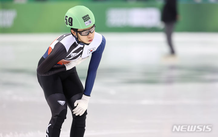 [강릉=뉴시스] 황준선 기자 = 22일 오후 강원 강릉 아이스아레나에서 열린 2024 강원동계청소년올림픽 대회 남자 쇼트트랙 500M 예선에서 한국 김유성이 1위로 결승선을 통과한 뒤 숨을 고르고 있다. 2024.01.22. [email protected]