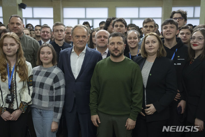 [도네츠크=AP/뉴시스] 볼로디미르 젤렌스키(오른쪽) 우크라이나 대통령과 도날트 투스크 폴란드 총리가 22일(현지시각) 키이우에서 학생들과 만남의 시간을 가진 후 기념 촬영을 하고 있다. 2024.01.23.