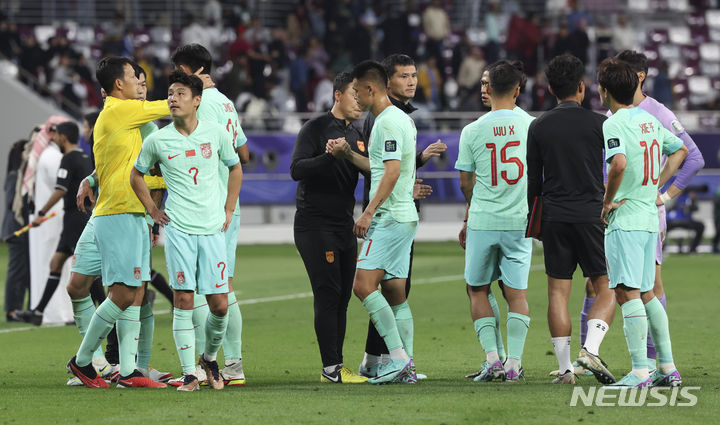 [도하(카타르)=뉴시스] 김근수 기자 = 22일(현지시각) 카타르 도하 칼리파 인터네셔널 경기장에서 열린 아시아축구연맹(AFC) 2023 카타르 아시안컵 A조 조별예선 3차전 카타르 대 중국의 경기, 카타르 알 하이도스의 결승골로 카타르가 1:0 승리했다. 우레이 등 중국 축구대표팀 선수들이 아쉬워하고 있다. 2024.01.23. [email protected]