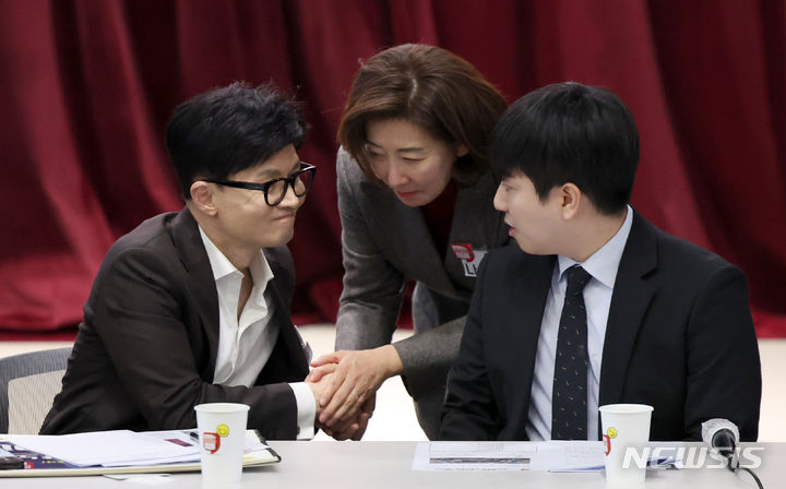 [서울=뉴시스] 김선웅 기자 = 한동훈 국민의힘 비상대책위원장과 나경원 전 원내대표가 24일 서울 동작구 숭실대학교 한경직기념관에서 열린 "함께하는 대학생의 미래" 대학생 간담회에서 인사를 나누고 있다. 2024.01.24. [email protected]