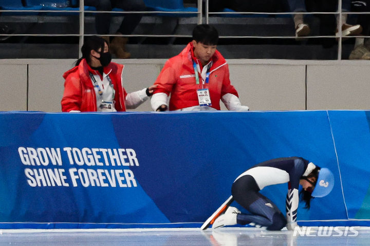 [강릉=뉴시스] 권창회 기자 = 26일 오후 강원도 강릉 스피드스케이팅경기장에서 열린 2024 강원동계청소년올림픽 대회 여자 매스스타트 결승 경기, 대한민국 임리원(3번)이 경기 도중 넘어져 있다. 2024.01.26. [email protected]