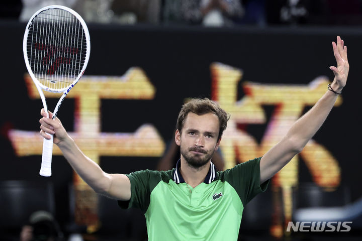 [멜버른=AP/뉴시스] 다닐 메드베데프(3위·러시아)가 26일(현지시각) 호주 멜버른 파크에서 열린 호주오픈 남자 단식 4강전에서 알렉산데르 즈베레프(6위·독일)를 물리친 후 기뻐하고 있다. 메드베데프는 두 세트를 내주고 세 세트를 내리 이기는 대역전극으로 즈베레프를 3-2(5-7 3-6 7-6 7-6 6-3)로 꺾고 결승에 올라 얀니크 신네르(4위·이탈리아)와 우승을 다툰다. 2024.01.27.