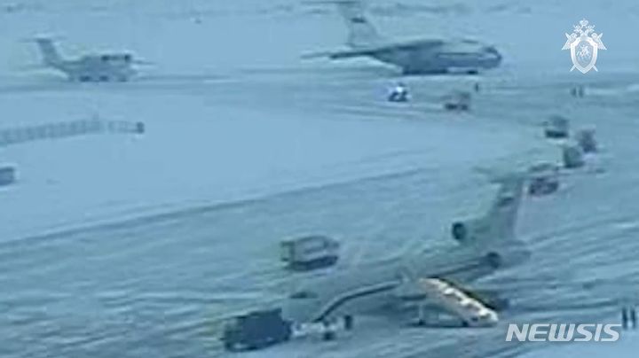 [야블로노브=AP/뉴시스] 러시아 조사위원회가 26일(현지시각) 공개한 영상 속 사진에 우크라이나 포로를 태운 버스들이 대기 중인 러시아 Il-76 수송기에 접근하고 있다. 이 수송기는 24일 벨고로드주 야블로노보 인근에 추락해 탑승자 전원이 사망했으며 러시아는 이를 우크라이나의 공격 때문이라고 주장했다. 우크라이나는 "러시아가 포로 교환 시 통상 행하는 수송기 관련 정보 제공과 비행 안전 요청을 하지 않았다"라며, 러시아군이 우크라이나 무인기를 격추하려다 실수로 수송기를 타격했을 가능성도 제기했다. 2024.01.27.