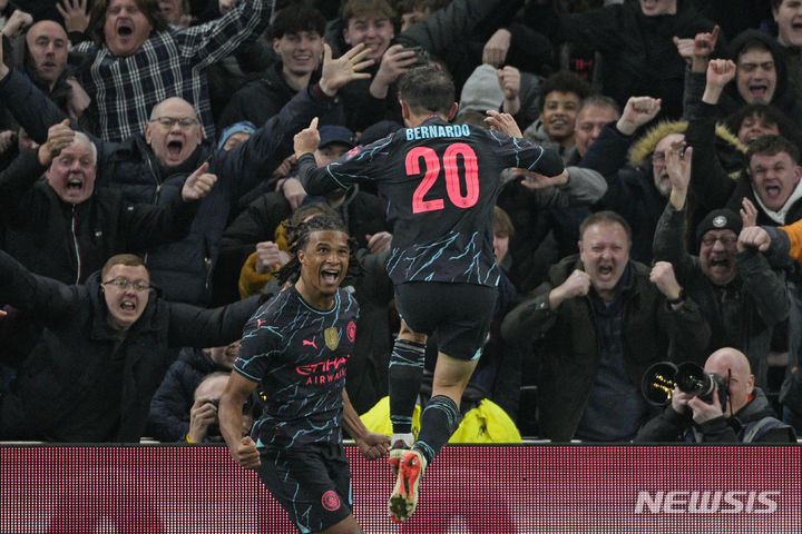 [런던=AP/뉴시스] 맨체스터 시티의 네이선 아케(왼쪽)가 26일(현지시각) 영국 런던의 토트넘 홋스퍼 스타디움에서 열린 2023-24 잉글랜드 축구협회(FA)컵 4라운드 토트넘 홋스퍼와의 경기 후반 43분 선제 결승 골을 넣고 동료와 환호하고 있다. 맨시티는 손흥민이 빠진 토트넘을 1-0으로 꺾고 FA컵 16강에 진출했다. 2024.01.27.