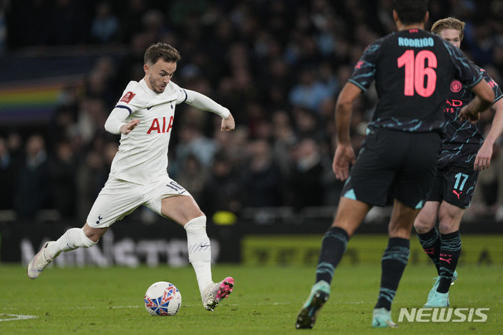 [런던=AP/뉴시스] 토트넘 홋스퍼의 제임스 매디슨이 26일(현지시각) 영국 런던의 토트넘 홋스퍼 스타디움에서 열린 2023-24 잉글랜드 축구협회(FA)컵 4라운드 맨체스터 시티와 경기 중 패스하고 있다. 손흥민이 빠진 토트넘은 0-1로 패해 16강 진출에 실패했다. 2024.01.27.