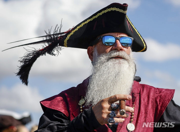 [탬파=AP/뉴시스] 27일(현지시각) 미 플로리다주 탬파에서 연례 '가스파릴라 해적 축제'가 열려 해적 복장을 한 로버트 살리바(53)라는 남성이 가스파릴라 침공이 시작되기 전 시가를 피우고 있다. 2024.01.28.