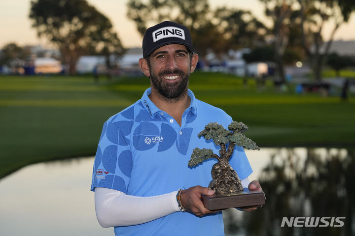 [샌디에이고=AP/뉴시스] 마티유 파본(프랑스)이 27일(현지시각) 미 캘리포니아주 샌디에이고의 토리파인트GC에서 열린 미국프로골프(PGA) 투어 파머스 인슈어런스 정상에 올라 트로피를 들고 포즈를 취하고 있다. 파본은 최종합계 13언더 275타로 우승, 프랑스 출신으로는 처음으로 PGA 우승컵을 들어 올렸다. 2024.01.28.