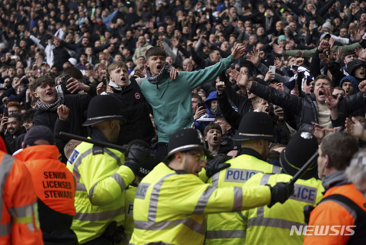 [웨스트 브로미치=AP/뉴시스] 28일(현지시각) 울버햄프턴 원더러스와 웨스트 브로미치 앨비언의 2023-24 잉글랜드축구협회(FA)컵 4라운드 경기가 열린 영국 웨스트 브로미치 더 호손스 경기장에 축구 팬들이 난입해 경찰과 충돌하고 있다. 이날 경기장 난동으로 경기가 약 38분 지연됐고 황희찬이 빠진 울버햄프턴은 2-0으로 승리해 16강에 올랐다. 2024.01.29.
