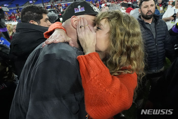 [볼티모어=AP/뉴시스] 미국 가수 테일러 스위프트(오른쪽)가 28일(현지시각) 미 메릴랜드주 볼티모어의 M&T 뱅크 스타디움에서 열린 캔자스시티 치프스와 볼티모어 레이븐스의 AFC 챔피언 결승전을 마친 후 남자 친구인 캔자스시티의 타이트 엔드 트래비스 켈스와 얘기하고 있다. 이 경기에서 캔자스시티가 17-10으로 이기며 슈퍼볼에 진출했다. 2024.01.29.