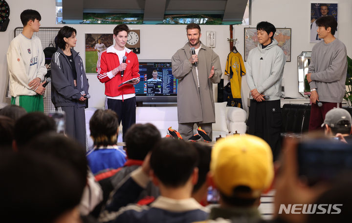 [서울=뉴시스] 김진아 기자 = 미국 메이저리그사커(MLS) 인터 마이애미의 구단주이자 축구 스타인 데이비드 베컴이 29일 서울 명동 아디다스 브랜드 플래그십 서울에서 열린 '프레데터 출시 30주년 기념 전시'에서 토크쇼를 하고 있다. 2024.01.29. [email protected]