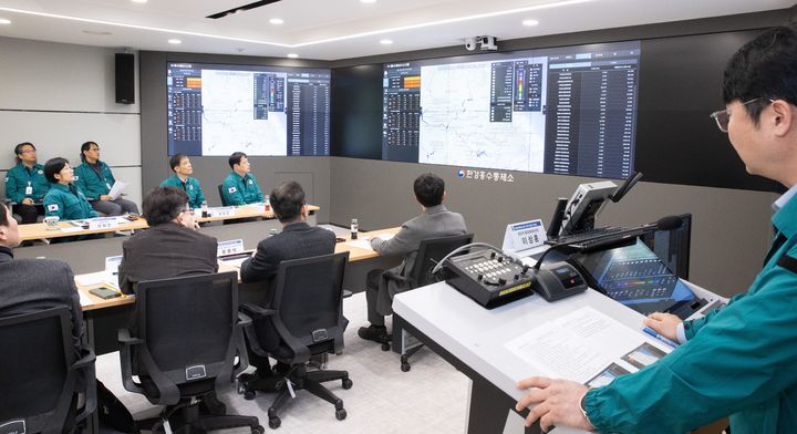 [서울=뉴시스] 한화진 환경부 장관이 30일 서울 서초구 한강홍수통제소에서 AI홍수예보체계의 개발 상황을 점검하고 홍수 및 방재 전문가와 함께 홍수예측의 정확도를 높이는 방안 등을 논의하고 있다. (사진=환경부 제공) 2024.01.30. photo@newsis.com *재판매 및 DB 금지