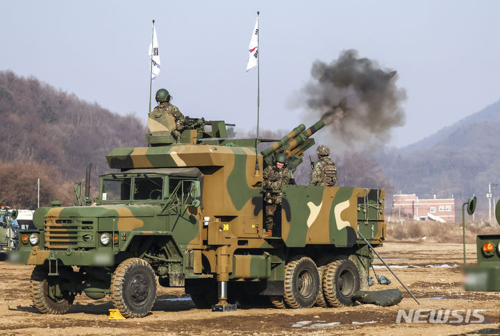 [파주=뉴시스] 정병혁 기자 = 31일 경기 파주시 무건리훈련장에서 열린 17사단 보병여단 포병대대 통합 K105A1 자주포 포탄사격훈련에서 K105A1 자주포가 포탄을 발사하고 있다. 이번 훈련은 17사단 보병여단 예하 포병대대 장병들이 통합 사격을 통해 ‘즉각, 강력히, 끝까지’ 응징할 수 있는 능력을 향상시키는데 중점을 뒀다. 2024.01.31. [email protected]
